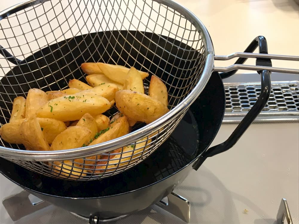 揚げかごは、一気に油から引き上げる事ができて、仕上がりが均一に。