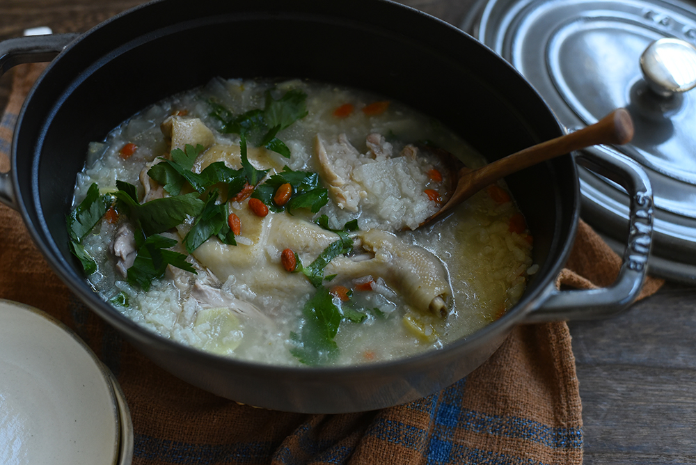 骨付き鶏もも肉、もち米、にんにく、しょうが、クコの実などの材料を切って入れてコトコト20分煮込み、火を止めて20分おくだけで、肉はほろほろ、優しい味わいのスープごはんができあがります。