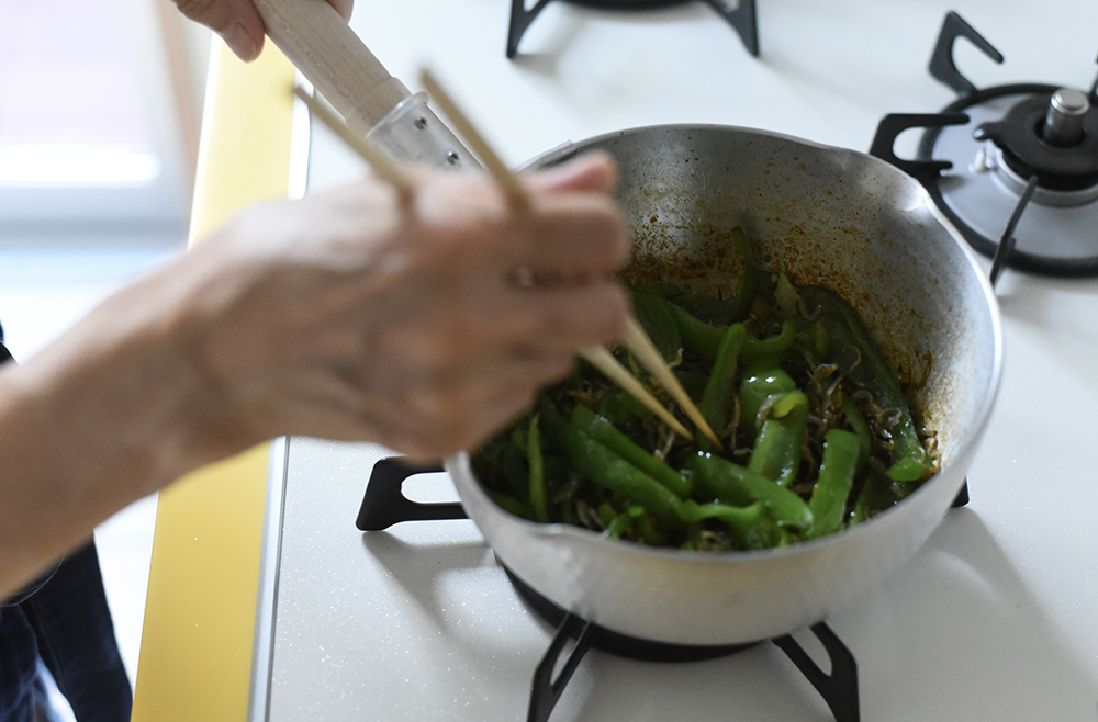 こちらも鍋ひとつでさっと調理できる無限ピーマンレシピ。カリカリに炒ったじゃことごま油の香り、ピーマンのほろ苦さが食欲そそる一品に。