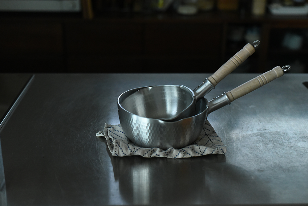 中尾アルミ 打出雪平鍋|純度の高い上質なアルミ材を使用した日本製の打出雪平鍋。軽くて火の通りが早く使い勝手がよく、煮物・お吸い物・味噌汁や湯沸しなどに適しています。プロの料理人、日本を代表する高級ホテルの厨房でも使用されているそうです。