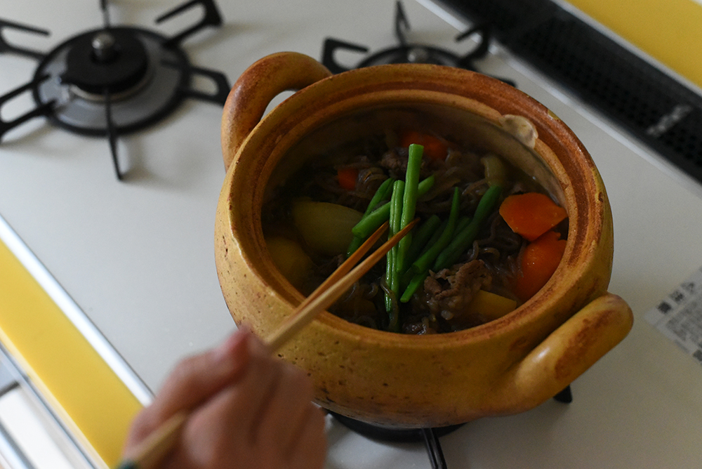 蓄熱力の高い土鍋を活用して余熱調理で作る「肉じゃが」は煮くずれせず、芯までホクホク! 味がしっかりしみた煮物は野菜もたっぷり食べられ、気持ちまでほっこりします。