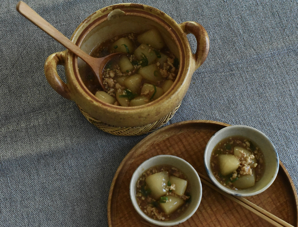 そしてやさしい味わいのそぼろ餡をたっぷりと。後を引くおいしさの「大根のそぼろ餡」の出来上がりです。
