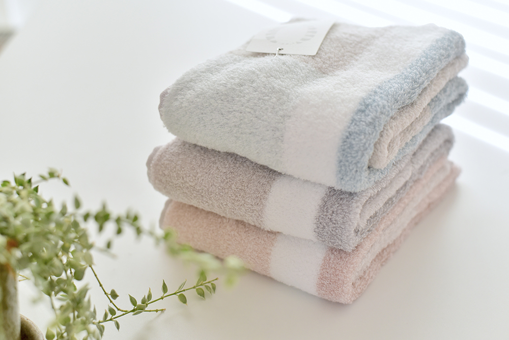 グレーとベージュの中間色である「グレージュ」を使用したニュアンスカラーが見た目にもやさいいタオル。繊維間にたくさんの空気を含んでいるので、ボリュームが出てふわふわな感触が持続します。