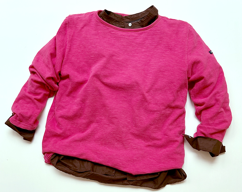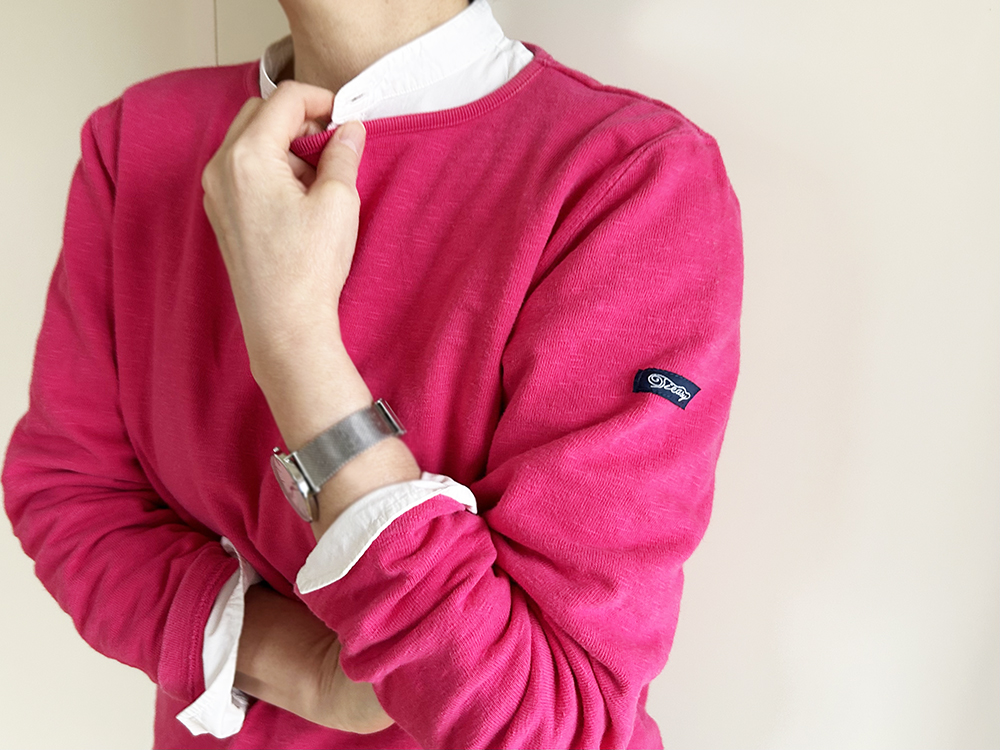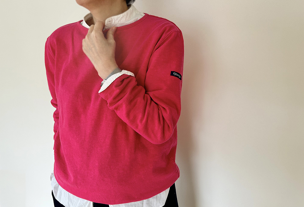 「肩幅があるせいか、バスクシャツの特徴のボートネックにずっと苦手意識がありました。初回のPOP-UP STOREで顔映りの良いピンクに出会い……コレいいんじゃない!?と思い試着してみました。