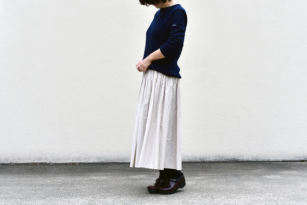「普段パンツもスカートも履きますが、手持ちのグレーやカーキ色など、ボトムスを選ばず合わせやすいです。私は一年中長袖を着ることが多いのですが、スラブ生地は通気性があるからか、真夏以外は着回せる感じです(もちろん個人差あり。暑がりの方は初夏でも難しいかも…)。