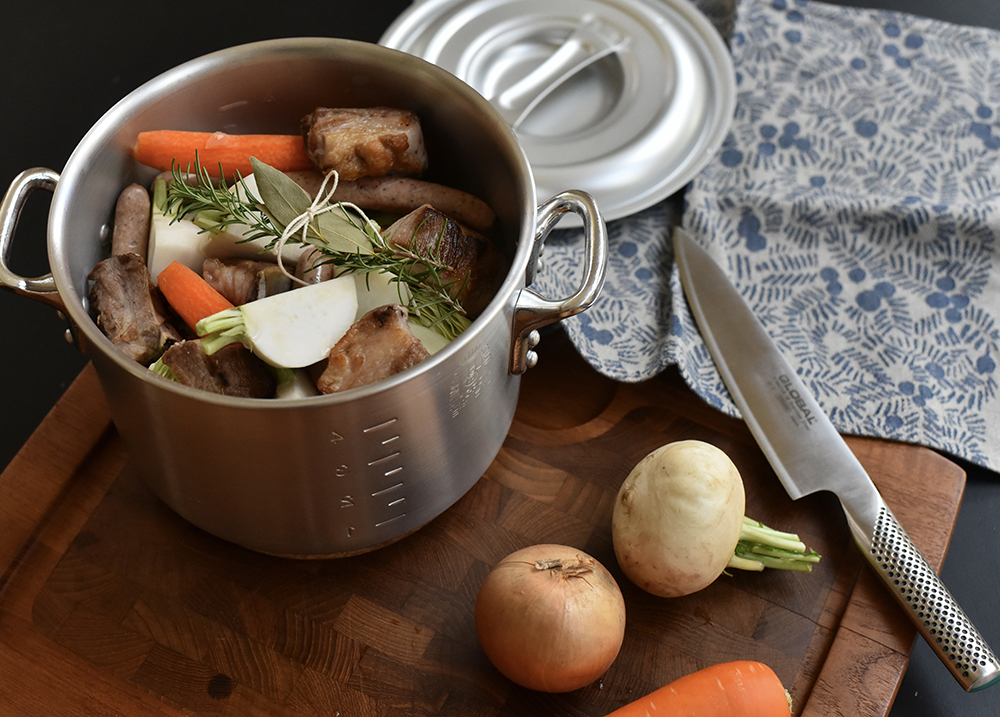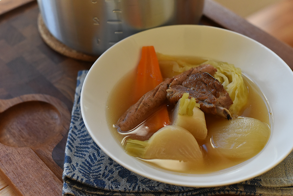 今からの季節におすすめ、かぶとスペリアリブのポトフ。一晩塩をしたスペアリブを焼き付け、野菜と一緒に1時間ほどコトコト煮込むだけ。驚くほどお肉がほろほろに!