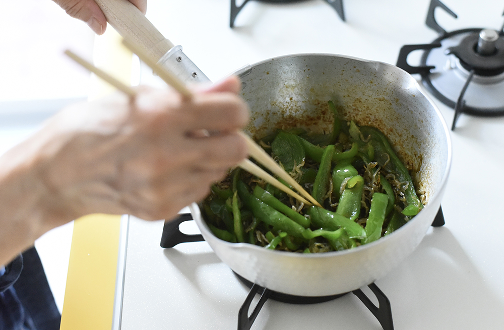 ピーマンとじゃこ炒め。火の通りがよいためピーマンのグリーンがきれいなまま完成します。