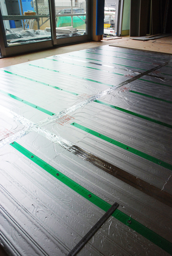 今回は、フローリングを貼る前に、リビング・ダイニング・キッチンの全てに温水床暖房を設置しました。