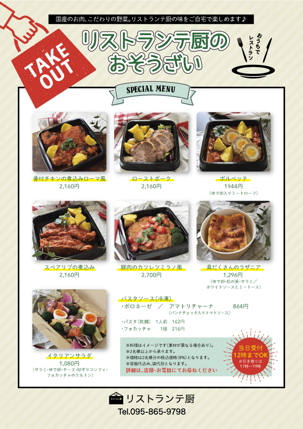 2/22(火)より【リストランテ厨のおそうざい】のテイクアウト始めます!